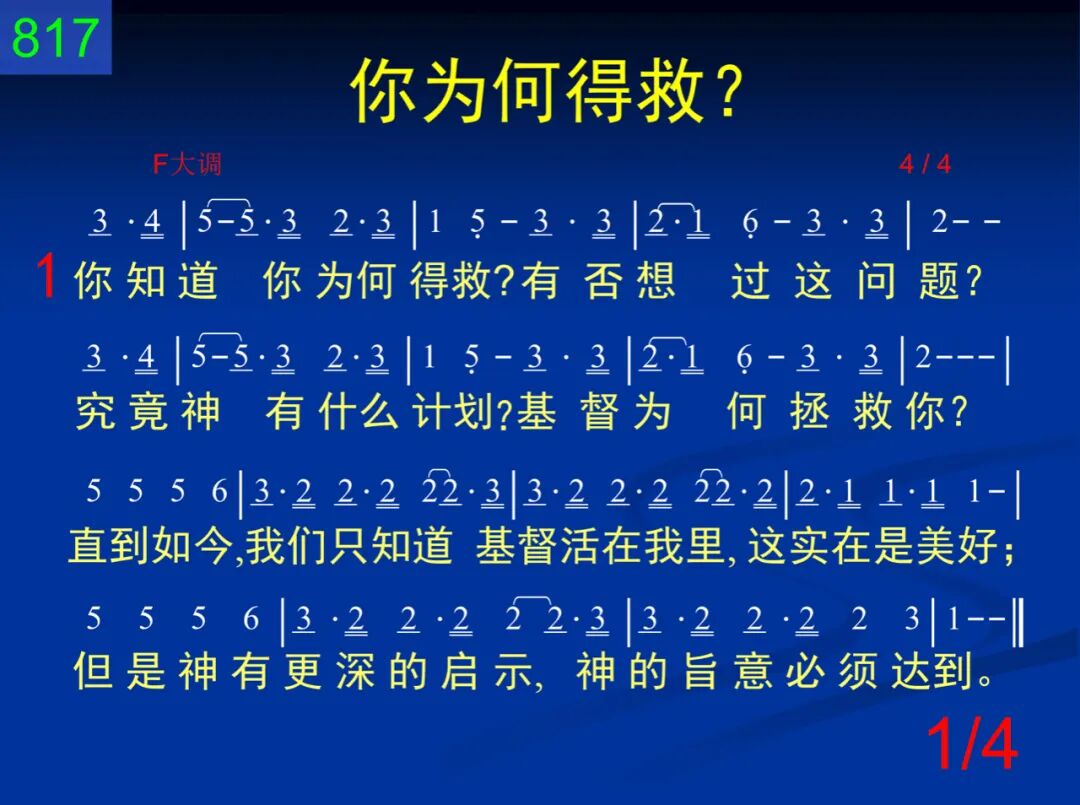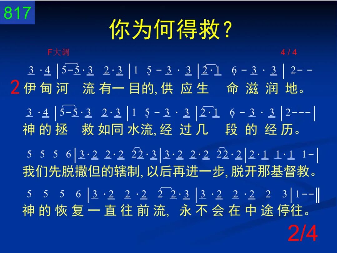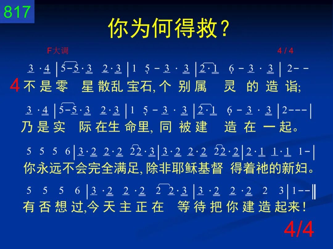 你知道你为何得救,有否想过这问题?究竟神有什么计划?基督为何拯救你?直到如今,我们只知道基督活在我里,这实在是美好;但是神有更深的启示,神的旨意必须达到。 二 伊甸河流有一目的,供应生命滋润地。神的拯救如同水流,经过几段的经历。我们先脱撒但的辖制,以后再进一步,脱开那基督教。神的恢复一直往前流,永不会在中途停往。 三 不是仅仅一个信徒,单单独独到处荡;乃是活石同被建造,团体基督得显彰。我们重生为着得更新,但基督进你心,还有另一缘故;祂作我们生命的缘故,为要得着祂的新妇。 四 不是零星散乱宝石,个别属灵的造诣;乃是实际在生命里,同被建造在一起。你永远不会完全满足,除非耶稣基督得着祂的新妇。有否想过,今天主正在等待把你建造起来!