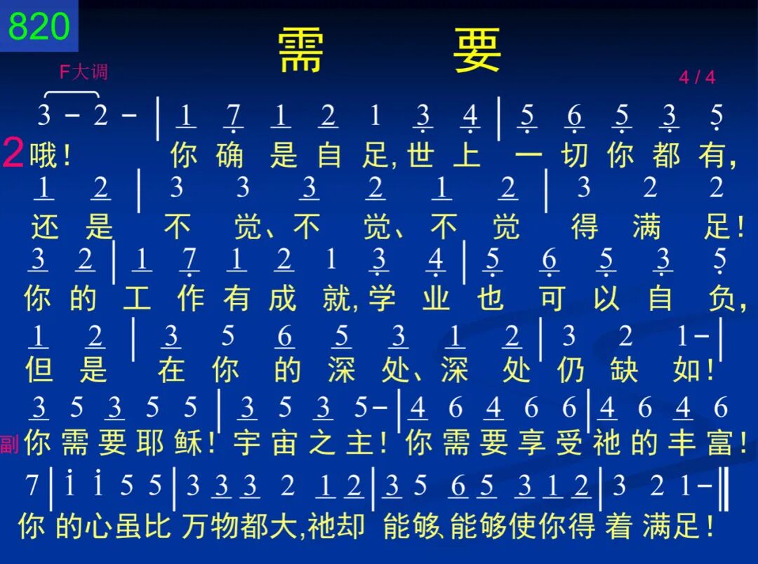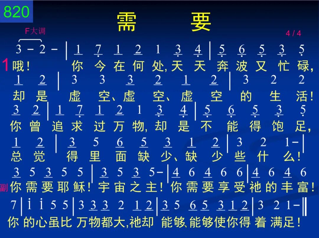 哦!你今在何处,天天奔波又忙碌,却是虚空、虚空、虚空的生活!你曾追求过万物,却是不能得饱足,总觉得里面缺少、缺少些什么! 你需要耶稣!宇宙之主!你需要享受祂的丰富!你的心虽比万物都大,祂却能够、能够使你得着满足! 二 哦!你确是自足,世上一切你都有,还是不觉、不觉、不觉得满足!你的工作有成就,学业也可以自负,但是在你的深处、深处仍缺如! 你需要耶稣!宇宙之主!你需要享受祂的丰富!你的心虽比万物都大,祂却能够、能够使你得着满足!