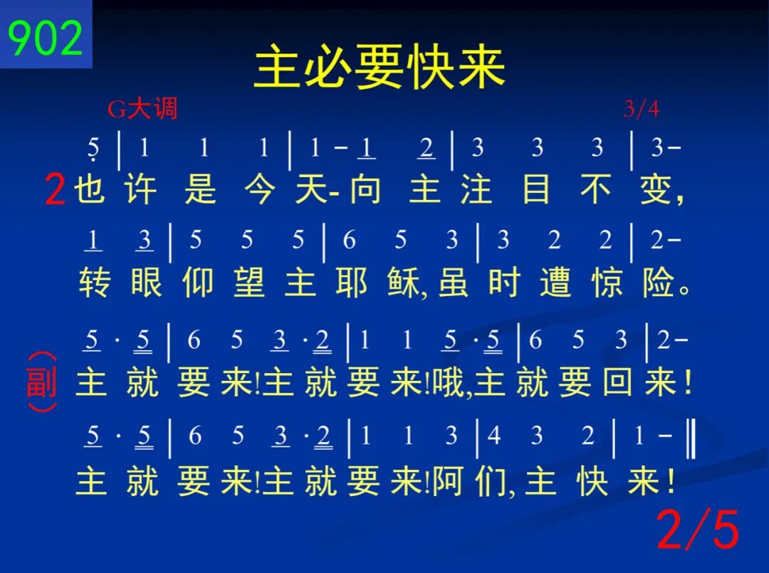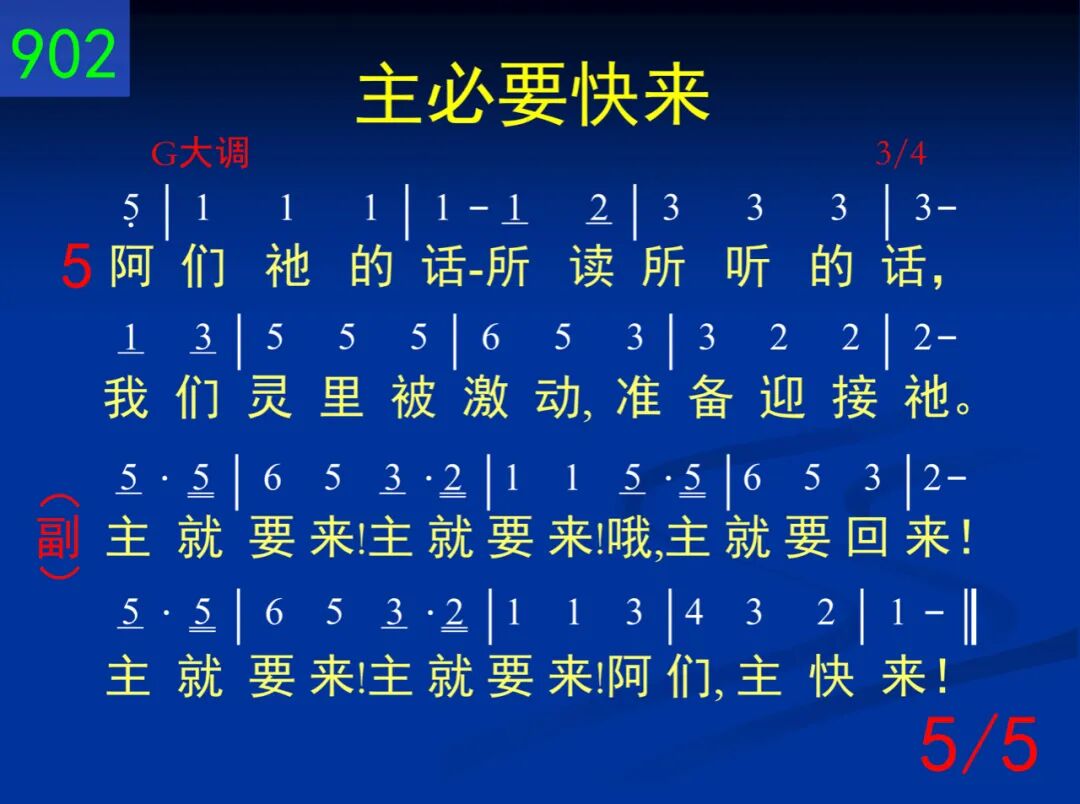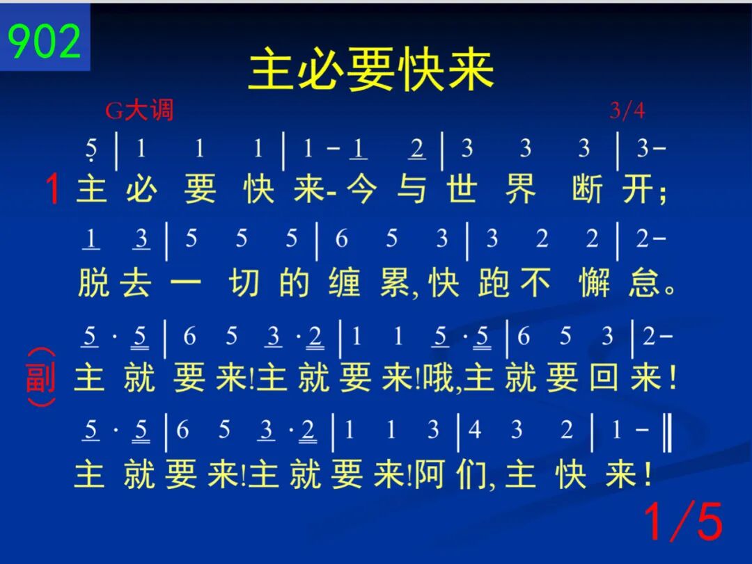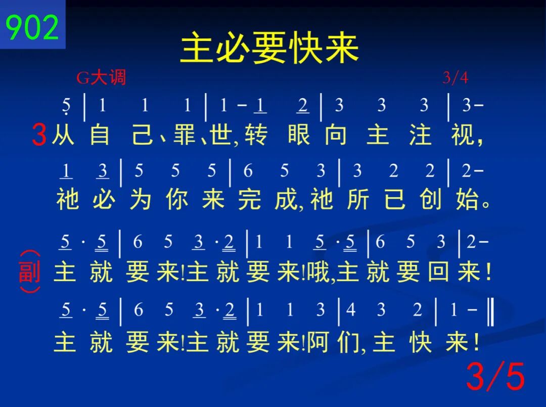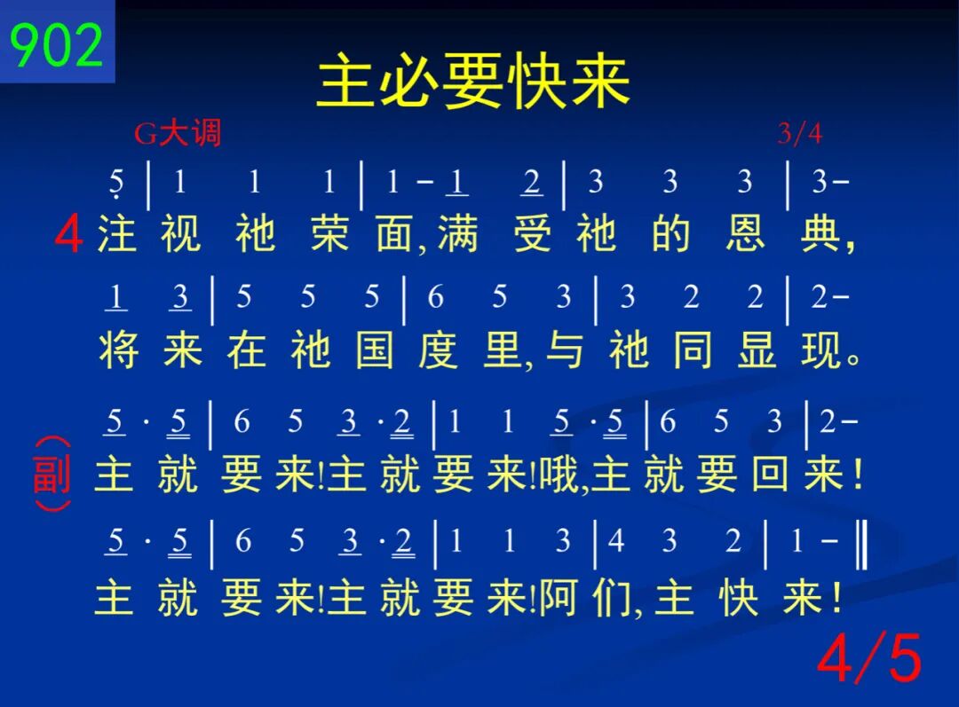 主必要快来─今与世界断开;脱去一切的缠累,快跑不懈怠。 主就要来!主就要来!哦,主就要回来!主就要来!主就要来!阿们,主快来! 二 也许是今天─向主注目不变,转眼仰望主耶稣,虽时遭惊险。 主就要来!主就要来!哦,主就要回来!主就要来!主就要来!阿们,主快来! 三 从自己、罪、世,转眼向主注视,祂必为你来完成,祂所已创始。 主就要来!主就要来!哦,主就要回来!主就要来!主就要来!阿们,主快来! 四 注视祂荣面满受祂的恩典,将来在祂国度里,与祂同显现。 主就要来!主就要来!哦,主就要回来!主就要来!主就要来!阿们,主快来! 五 阿们祂的话─所读所听的话,我们灵里被激动;准备迎接祂。 主就要来!主就要来!哦,主就要回来!主就要来!主就要来!阿们,主快来!