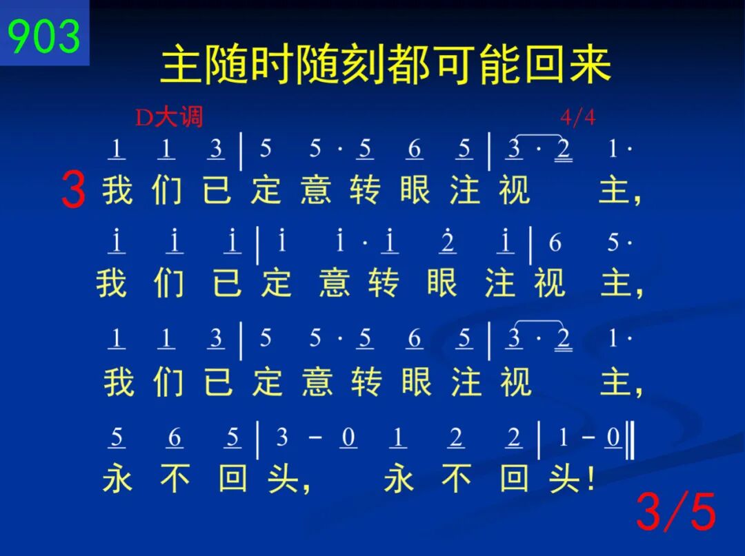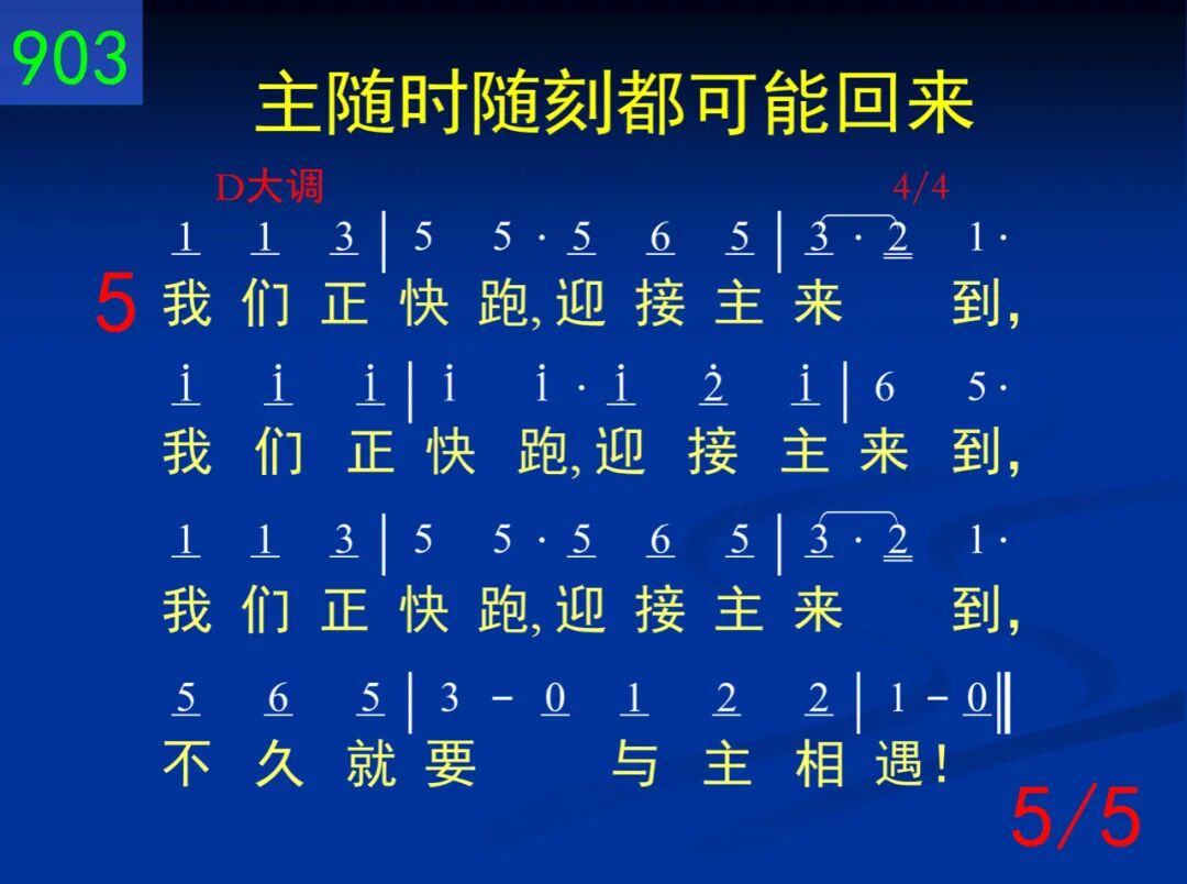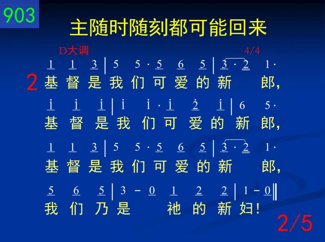 主随时随刻都可能回来,主随时随刻都可能回来,主随时随刻都可能回来,哦,让我们儆醒等待! 二 基督是我们可爱的新郎,(重复三次,下同)我们乃是祂的新妇! 三 我们已定意转眼注视主,永不回头,永不回头! 四 路程在前头,缠累丢背后,加速向前!加速向前! 五 我们正快跑,迎接主来到,不久就要与主相遇!