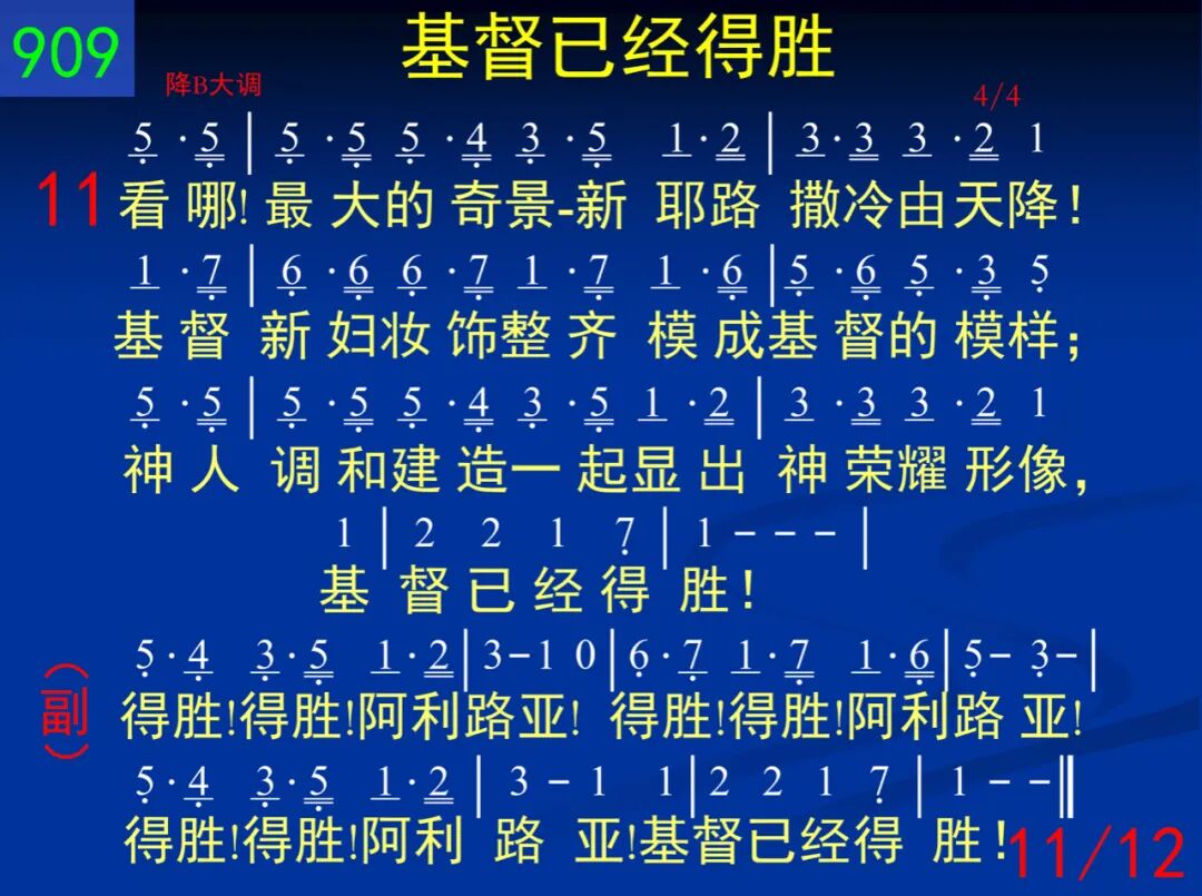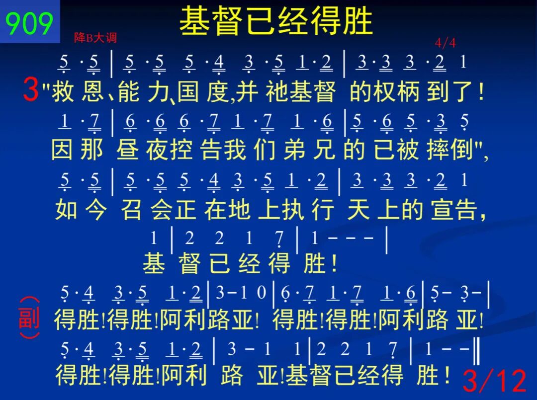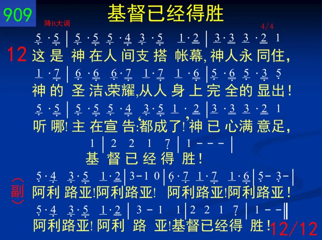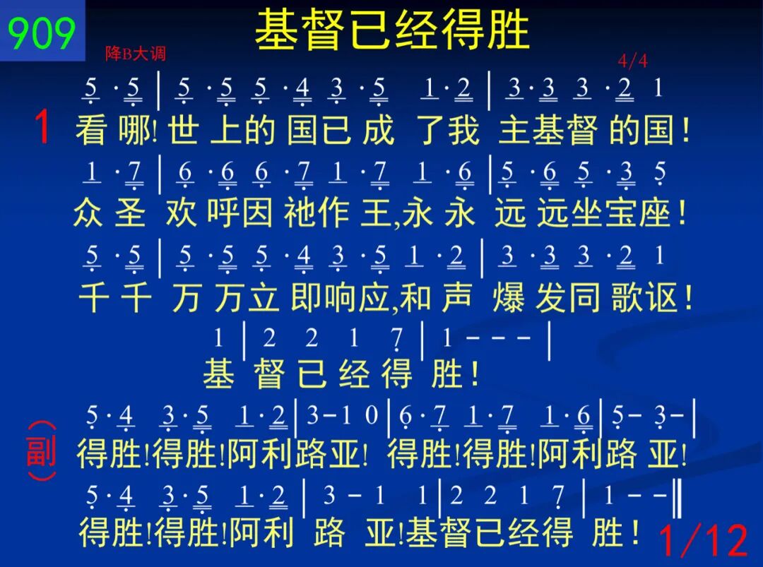 看哪!世上的国已成了我主基督的国!众圣欢呼因祂作王,永永远远坐宝座!千千万万立即响应,和声爆发同歌讴!基督已经得胜! 得胜!得胜!阿利路亚!得胜!得胜!阿利路亚!得胜!得胜!阿利路亚!基督已经得胜! 二 那古蛇,大龙,就是魔鬼已经被摔下去,撒但和他的使者不能再迷惑设骗局,我们颂赞之声如同雷鸣将主永高举。基督已经得胜! 得胜!得胜!阿利路亚!得胜!得胜!阿利路亚!得胜!得胜!阿利路亚!基督已经得胜! 三 “救恩、能力、国度,并祂基督的权柄到了!因那昼夜控告我们弟兄的已被摔倒,”如今召会正在地上执行天上的宣告,基督已经得胜! 得胜!得胜!阿利路亚!得胜!得胜!阿利路亚!得胜!得胜!阿利路亚!基督已经得胜! 四 我们胜过那控告者,因为宝血有功效,藉着口中的话,我们宣告:“一切都成了!”我们虽至于死,魂生命也不爱惜计较。基督已经得胜! 得胜!得胜!阿利路亚!得胜!得胜!阿利路亚!得胜!得胜!阿利路亚!基督已经得胜! 五 哦!弟兄们,姊妹们,请听天上又发声音:“巴比伦倾倒,倾倒了!”─怎能不令人欢欣。我们已从她出来,何等有福又可庆幸!基督已经得胜! 得胜!得胜!阿利路亚!得胜!得胜!阿利路亚!得胜!得胜!阿利路亚!基督已经得胜! 六 奥秘大巴比伦,她乃是众淫妇的母亲,我们极其憎恶她所装满的污秽邪淫;但神已加倍罚她,因此我们灵欢欣,基督已经得胜! 得胜!得胜!阿利路亚!得胜!得胜!阿利路亚!得胜!得胜!阿利路亚!基督已经得胜! 七 救恩、荣耀、权能,都属我们的神,赞美主!祂凭真实公义,讨罪伸冤,审判了淫妇。看!那烧她的烟直往上冒,让我们欢呼!基督已经得胜! 得胜!得胜!阿利路亚!得胜!得胜!阿利路亚!得胜!得胜!阿利路亚!基督已经得胜! 八 “神的众仆,无论大小,当赞美神,”祂嘱咐;如同众水的声音,又如雷鸣,群众同欢呼:“阿利路亚!我们的神全能者作王作主!”基督已经得胜! 得胜!得胜!阿利路亚!得胜!得胜!阿利路亚!得胜!得胜!阿利路亚!基督已经得胜! 九 现在我们应当欢喜快乐向神归荣耀;羔羊婚娶时候到了,新妇也已预备好,蒙了救恩穿上光明洁白的细麻义袍,基督已经得胜! 得胜!得胜!阿利路亚!得胜!得胜!阿利路亚!得胜!得胜!阿利路亚!基督已经得胜! 十 魔鬼身在火湖,这是约翰目睹的事实,今后不要怕他信口雌黄,或造谣生事,大胆宣告他的判辞,是圣徒得胜之路!基督已经得胜! 得胜!得胜!阿利路亚!得胜!得胜!阿利路亚!得胜!得胜!阿利路亚!基督已经得胜! 十一 看哪!最大的奇景─新耶路撒冷由天降!基督新妇妆饰整齐模成基督的模样;神人调和建造一起显出神荣耀形像,基督已经得胜! 得胜!得胜!阿利路亚!得胜!得胜!阿利路亚!得胜!得胜!阿利路亚!基督已经得胜! 十二 这是神在人间支搭帐幕,神人永同住,神的圣洁、荣耀,从人身上完全的显出!听哪!主在宣告:“都成了!”神已心满意足,基督已经得胜! 阿利路亚!阿利路亚!阿利路亚!阿利路亚!阿利路亚!阿利路亚!基督已经得胜!