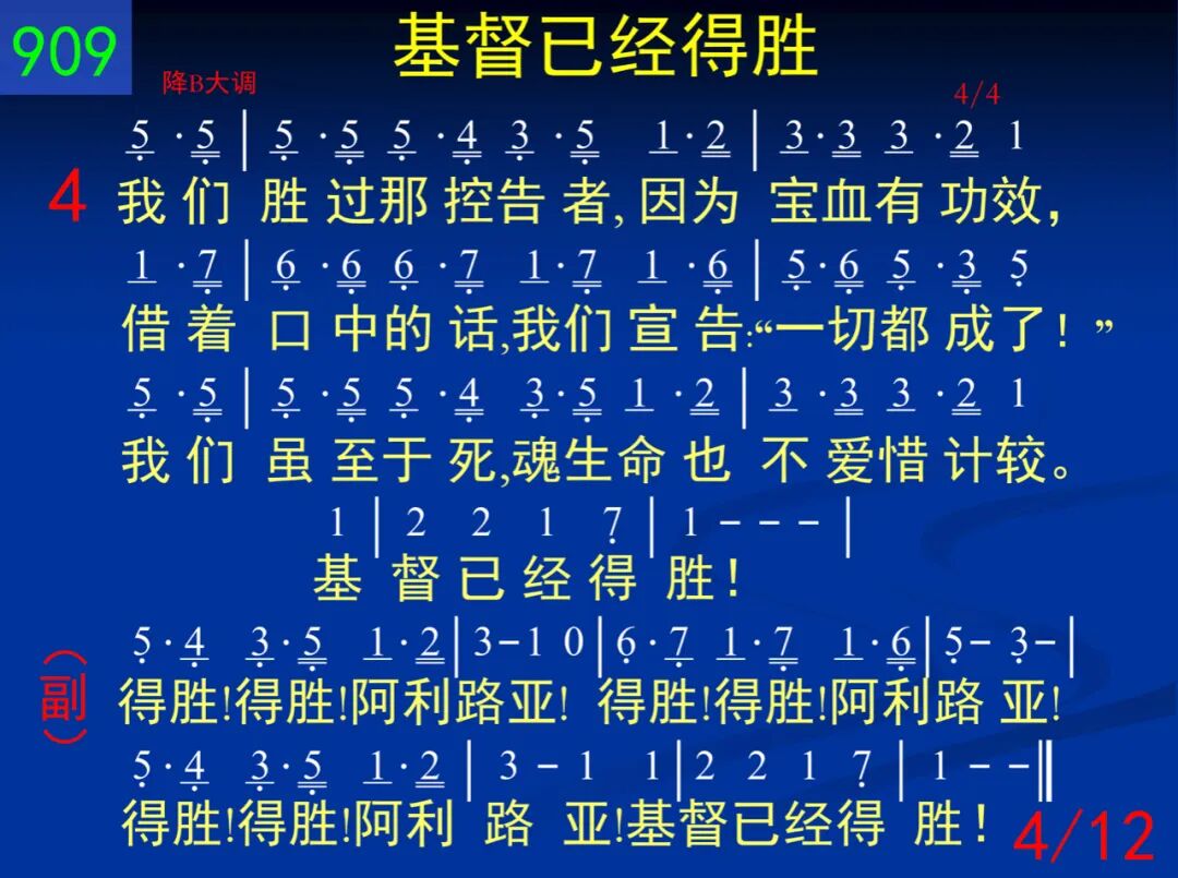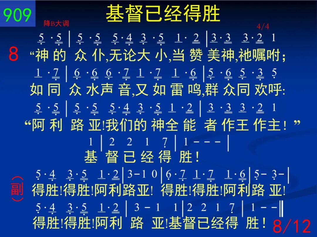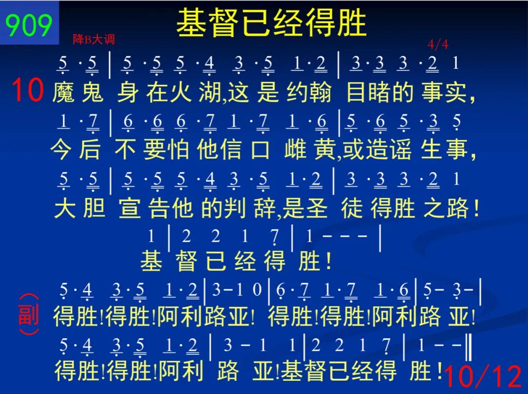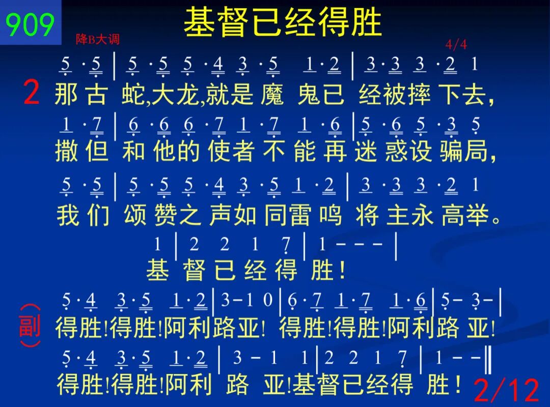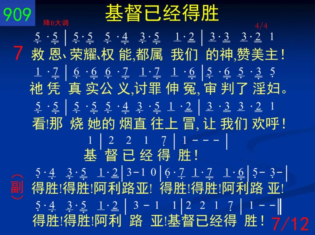 看哪!世上的国已成了我主基督的国!众圣欢呼因祂作王,永永远远坐宝座!千千万万立即响应,和声爆发同歌讴!基督已经得胜! 得胜!得胜!阿利路亚!得胜!得胜!阿利路亚!得胜!得胜!阿利路亚!基督已经得胜! 二 那古蛇,大龙,就是魔鬼已经被摔下去,撒但和他的使者不能再迷惑设骗局,我们颂赞之声如同雷鸣将主永高举。基督已经得胜! 得胜!得胜!阿利路亚!得胜!得胜!阿利路亚!得胜!得胜!阿利路亚!基督已经得胜! 三 “救恩、能力、国度,并祂基督的权柄到了!因那昼夜控告我们弟兄的已被摔倒,”如今召会正在地上执行天上的宣告,基督已经得胜! 得胜!得胜!阿利路亚!得胜!得胜!阿利路亚!得胜!得胜!阿利路亚!基督已经得胜! 四 我们胜过那控告者,因为宝血有功效,藉着口中的话,我们宣告:“一切都成了!”我们虽至于死,魂生命也不爱惜计较。基督已经得胜! 得胜!得胜!阿利路亚!得胜!得胜!阿利路亚!得胜!得胜!阿利路亚!基督已经得胜! 五 哦!弟兄们,姊妹们,请听天上又发声音:“巴比伦倾倒,倾倒了!”─怎能不令人欢欣。我们已从她出来,何等有福又可庆幸!基督已经得胜! 得胜!得胜!阿利路亚!得胜!得胜!阿利路亚!得胜!得胜!阿利路亚!基督已经得胜! 六 奥秘大巴比伦,她乃是众淫妇的母亲,我们极其憎恶她所装满的污秽邪淫;但神已加倍罚她,因此我们灵欢欣,基督已经得胜! 得胜!得胜!阿利路亚!得胜!得胜!阿利路亚!得胜!得胜!阿利路亚!基督已经得胜! 七 救恩、荣耀、权能,都属我们的神,赞美主!祂凭真实公义,讨罪伸冤,审判了淫妇。看!那烧她的烟直往上冒,让我们欢呼!基督已经得胜! 得胜!得胜!阿利路亚!得胜!得胜!阿利路亚!得胜!得胜!阿利路亚!基督已经得胜! 八 “神的众仆,无论大小,当赞美神,”祂嘱咐;如同众水的声音,又如雷鸣,群众同欢呼:“阿利路亚!我们的神全能者作王作主!”基督已经得胜! 得胜!得胜!阿利路亚!得胜!得胜!阿利路亚!得胜!得胜!阿利路亚!基督已经得胜! 九 现在我们应当欢喜快乐向神归荣耀;羔羊婚娶时候到了,新妇也已预备好,蒙了救恩穿上光明洁白的细麻义袍,基督已经得胜! 得胜!得胜!阿利路亚!得胜!得胜!阿利路亚!得胜!得胜!阿利路亚!基督已经得胜! 十 魔鬼身在火湖,这是约翰目睹的事实,今后不要怕他信口雌黄,或造谣生事,大胆宣告他的判辞,是圣徒得胜之路!基督已经得胜! 得胜!得胜!阿利路亚!得胜!得胜!阿利路亚!得胜!得胜!阿利路亚!基督已经得胜! 十一 看哪!最大的奇景─新耶路撒冷由天降!基督新妇妆饰整齐模成基督的模样;神人调和建造一起显出神荣耀形像,基督已经得胜! 得胜!得胜!阿利路亚!得胜!得胜!阿利路亚!得胜!得胜!阿利路亚!基督已经得胜! 十二 这是神在人间支搭帐幕,神人永同住,神的圣洁、荣耀,从人身上完全的显出!听哪!主在宣告:“都成了!”神已心满意足,基督已经得胜! 阿利路亚!阿利路亚!阿利路亚!阿利路亚!阿利路亚!阿利路亚!基督已经得胜!