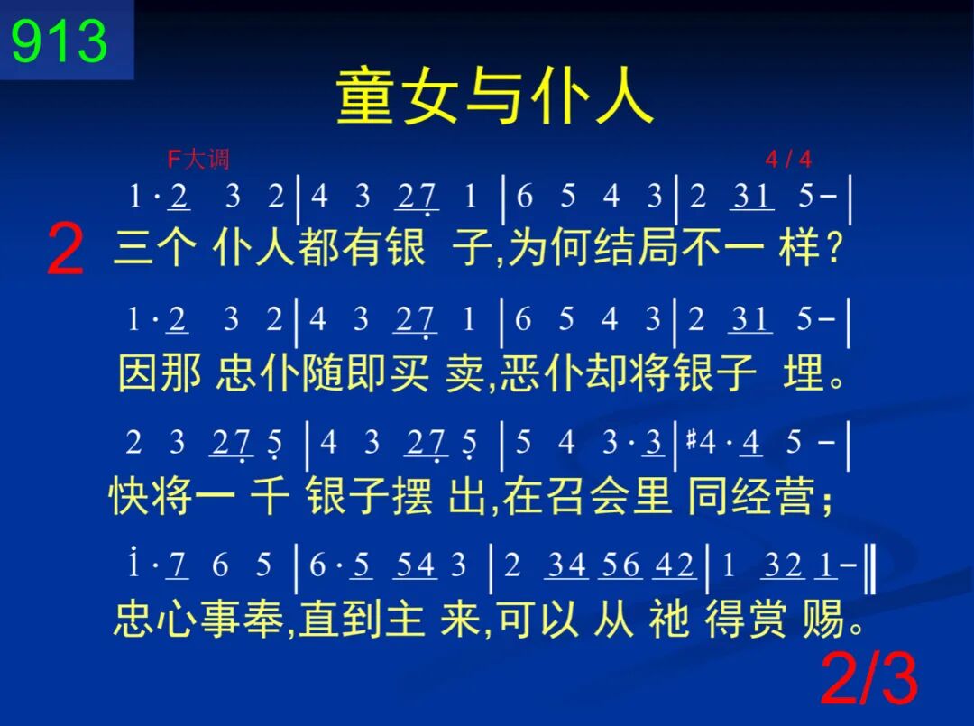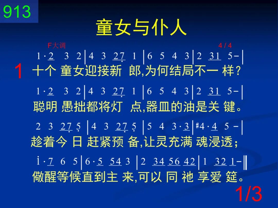 十个童女迎接新郎,为何结局不一样?聪明愚拙都将灯点,器皿的油是关键。趁着今日赶紧预备,让灵充满魂浸透;儆醒等候直到主来,可以同祂享爱筵。 二 三个仆人都有银子,为何结局不一样?因那忠仆随即买卖,恶仆却将银子埋。快将一千银子摆出,在召会里同经营;忠心事奉,直到主来,可以从祂得赏赐。 三 不多时候,要来就来,我们儆醒齐等待,不可辜负主的委派,忠心良善得赏赉。基督台前,审判钟点,主的公义威荣显,金银宝石能耐火焰,千年国度掌王权。