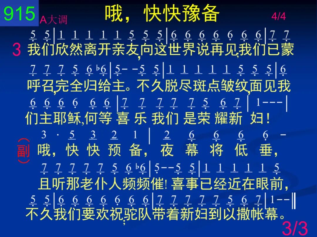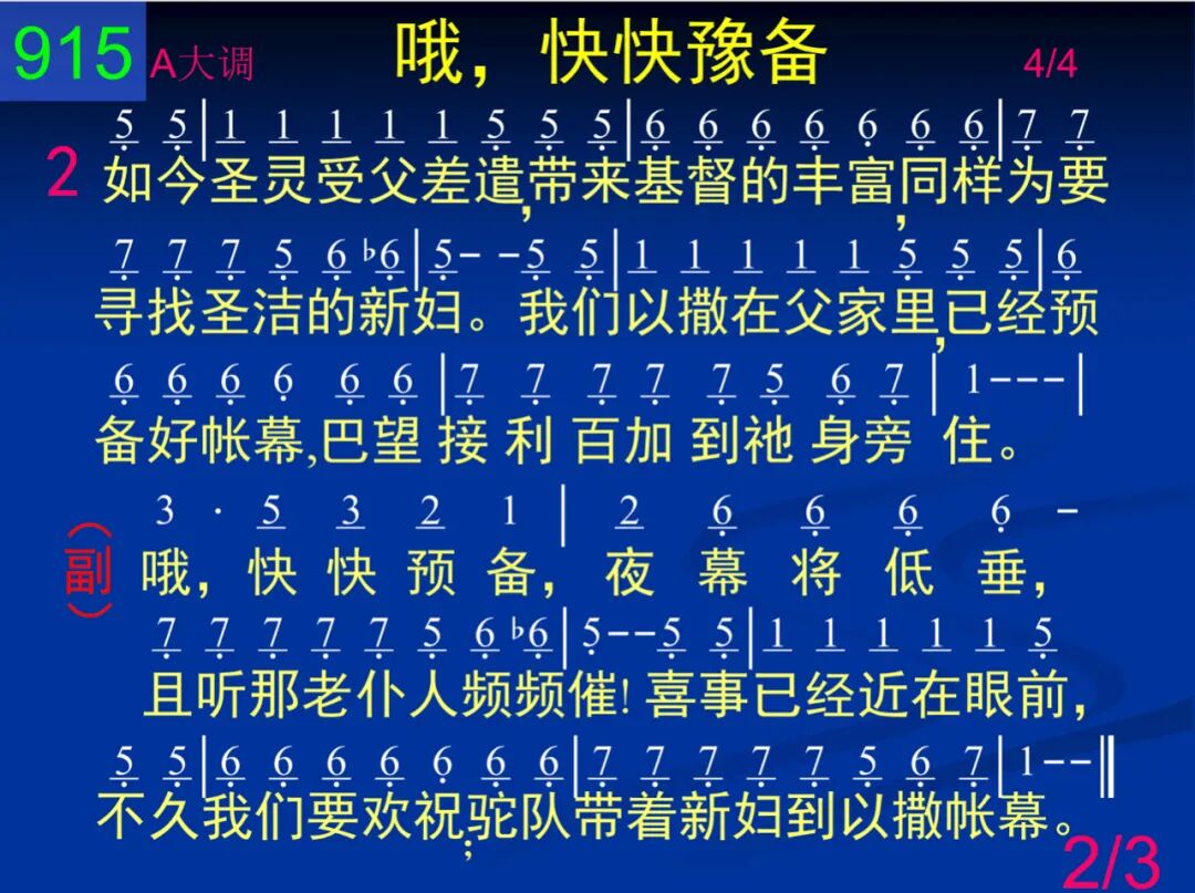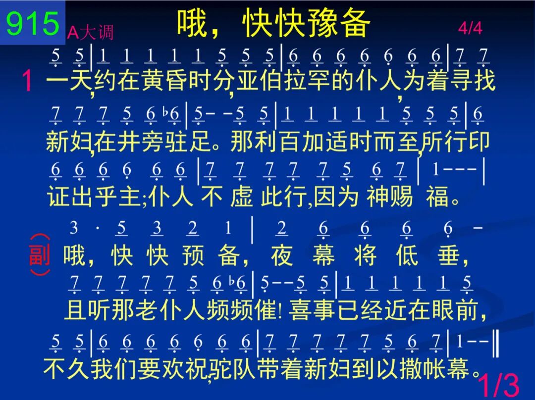一天,约在黄昏时分,亚伯拉罕的仆人,为着寻找新妇,在井旁驻足。那利百加适时而至,所行印证出乎主;仆人不虚此行,因为神赐福。 哦,快快预备,夜幕将低垂,且听那老仆人频频催!喜事已经近在眼前,不久我们要欢祝;驼队带新妇到以撒帐幕。 二 如今圣灵受父差遣,带来基督的丰富,同样为要寻找圣洁的新妇。我们以撒在父家里,已经预备好帐幕,巴望接利百加到他身旁住。 哦,快快预备,夜幕将低垂,且听那老仆人频频催!喜事已经近在眼前,不久我们要欢祝;驼队带新妇到以撒帐幕。 三 我们欣然离开亲友,向这世界说再见;我们已蒙呼召,完全归给主。不久脱尽斑点皱纹,面见我们主耶稣,何等喜乐我们是荣耀新妇! 哦,快快预备,夜幕将低垂,且听那老仆人频频催!喜事已经近在眼前,不久我们要欢祝;驼队带新妇到以撒帐幕。