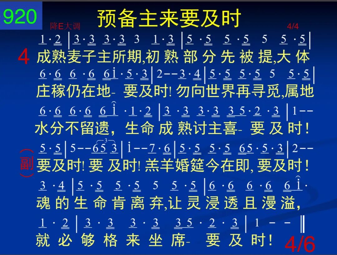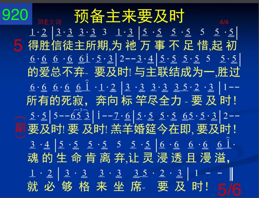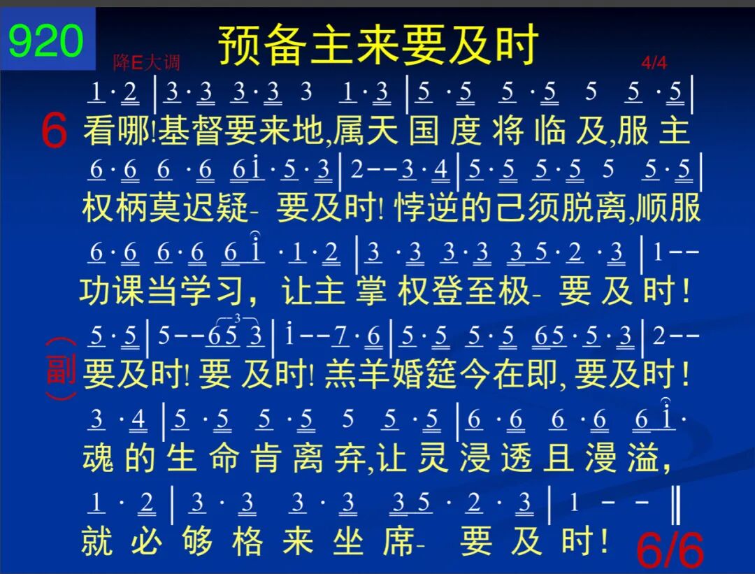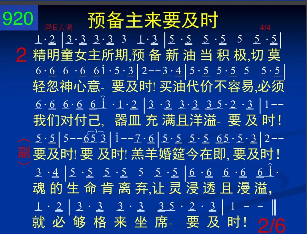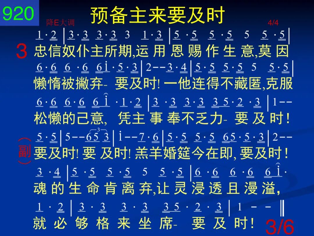 荣耀新妇主所期,喜乐婚筵祂备齐;穿上洁净细麻衣─要及时!经过苦难与死地,基都生命紧凭倚,活出之义成所披─要及时! 二 精明童女主所期,预备新油当积极,切莫轻忽神心意─要及时!买油代价不容易,必须我们对付己,器皿充满且洋溢─要及时! 三 忠信奴仆主所期,运用恩赐作生意,莫因懒惰被撇弃─要及时!一他连得不藏匿,克服松懒的己意,凭主事奉不乏力─要及时! 四 成熟麦子主所期,初熟部分先被提,大体庄稼仍在地─要及时!勿向世界再寻觅,属地水分不留遗,生命成熟讨主喜─要及时! 五 得胜信徒主所期,为祂万事不足惜,起初的爱总不弃─要及时!与主联结成为一,胜过所有的死寂,奔向标竿尽全力─要及时! 六 看哪!基督要来地,属天国度将临及,服主权柄莫迟疑─要及时!悖逆的己须脱离,顺服功课当学习,让主掌权登至极─要及时!