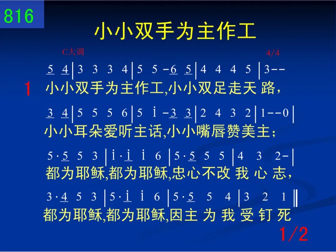 小小双手为主作工,小小双足走天路,小小耳朵爱听主话,小小嘴唇赞美主; 副 都为耶稣,都为耶稣,忠心不改我心志,都为耶稣,都为耶稣,因主为我受钉死。 二 小小眼睛爱看圣经,小小双膝敬拜主,小小头脑学习主话,小小心灵信靠主;