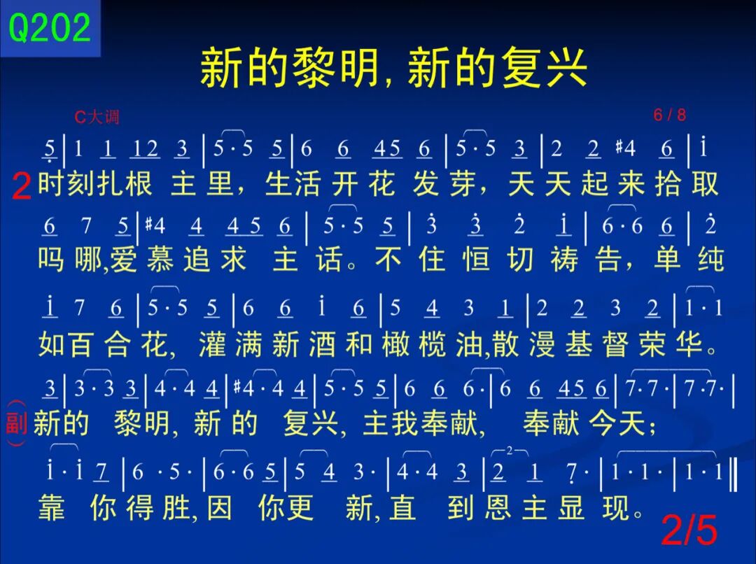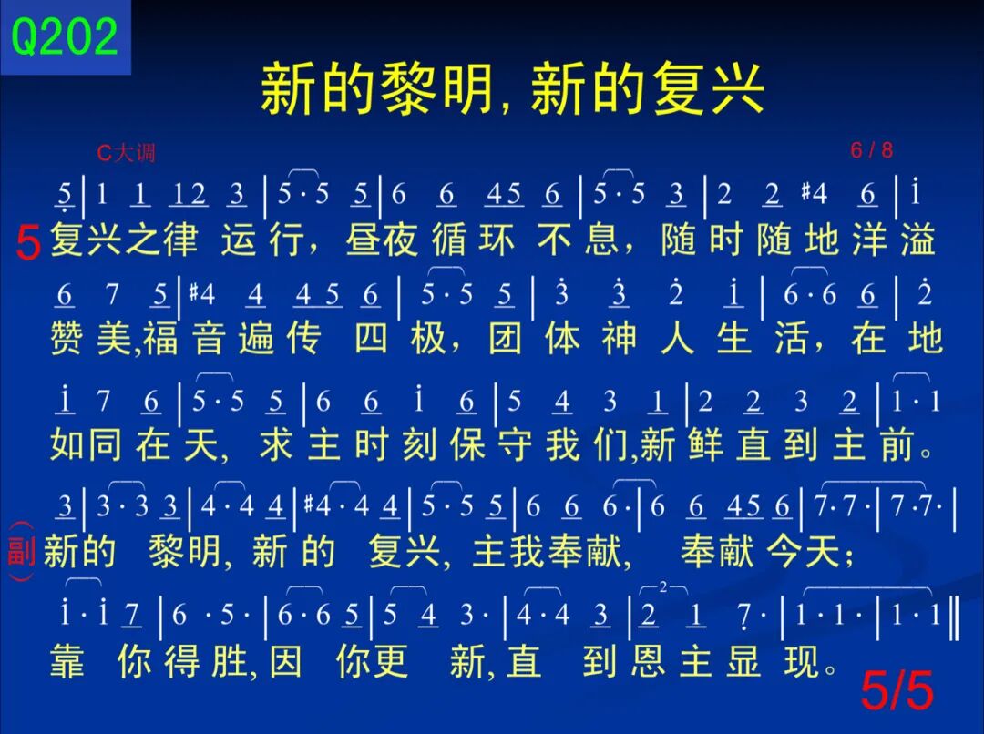 5.复兴之律来临,昼夜循环不息, 随时随地洋溢赞美,福音遍传四极。 团体神人生活,在地如同在天,求主时刻保守我们,新鲜直到主前。 注:2012年暑期华语学生成全训练。
