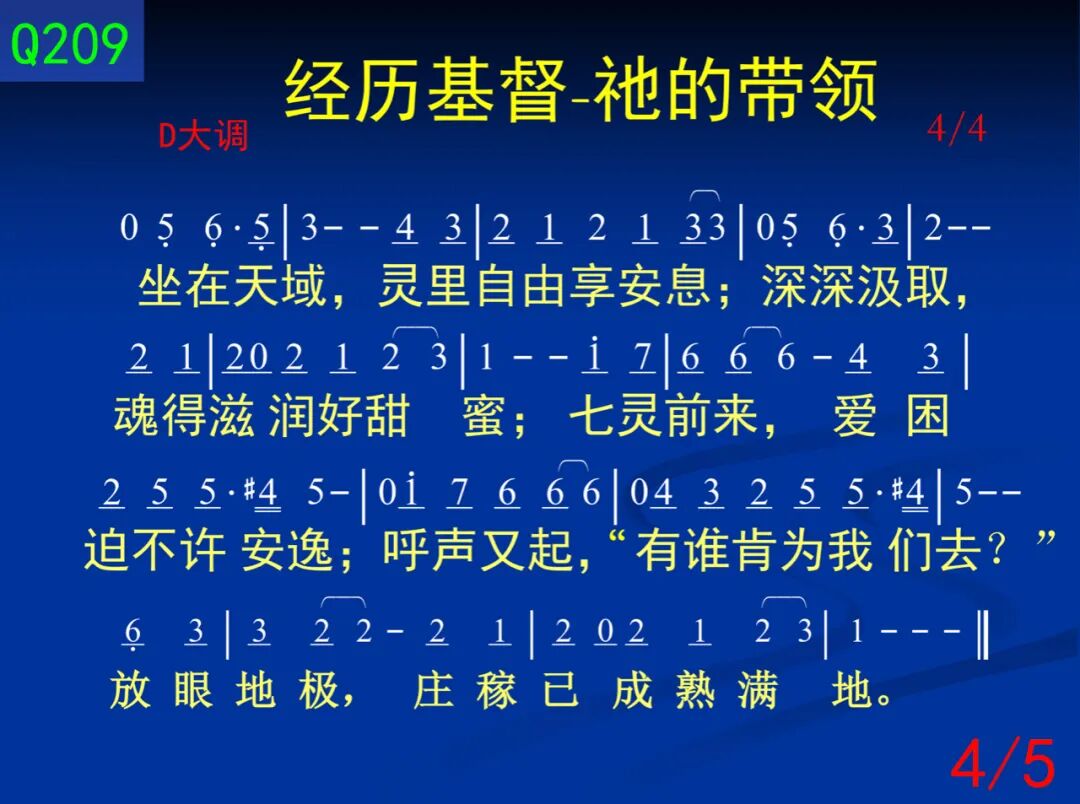 四:坐在天域,灵里自由享安息;深深汲取,魂得滋养好甜蜜;七灵前来,爱困破不许安逸;呼声又起,有谁肯为我们去?放眼地级,庄稼已成熟满地